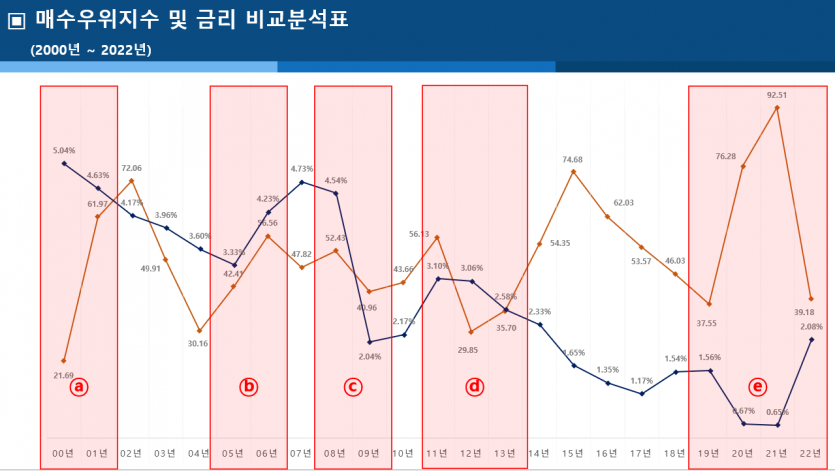 해당 그래프를 통하여 2000년도부터 2022년 현재까지의 매수우위지수와 금리에 대해서 비교·분석해보고자 한다. 일반적인 상황에서 금리와 부동산시장은 반비례하여